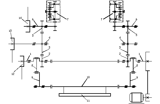 傳統的噴氣織機的傳動系統如圖11-2所示。主電動機通過組合型三角皮帶傳動織機主軸1,由主軸通過主軸齒輪2及中心軸齒輪3傳動中心軸4,再由中心軸齒輪3和絞邊軸齒輪5傳動絞邊軸6。主軸與中心軸的轉速比為2:1,與絞邊軸的轉速比為1:1。窄幅噴氣織機通常通過四連桿裝置驅動打緯機構,主軸通過連桿機構的牽手8使擺臂(筘座腳)9往復擺動,帶動鋼筘打緯。同時,由絞邊軸傳動絞邊機構7,并通過三角皮帶輪14傳動送經機構。另外主軸通過齒型帶輪