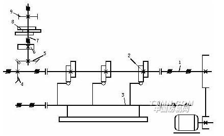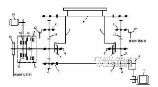 如圖11-1所示,電動機通過2~3根A型三角皮帶傳動織機主軸1,再由主軸通過主軸齒輪2及中心軸齒輪3 傳動中心軸4。主軸與中心軸的轉速比為2:1。主軸通過牽手5使筘座腳6擺動,帶動鋼筘打緯。同時,由筘座腳傳動送經機構和卷取機構,由織機的中心軸驅動開口機構、投梭機構、斷經自停機構以及斷緯自停機構。這樣就帶動了全機的運轉。有梭織機的傳動系統如下: