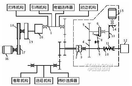 10-定位圈? 11-彈簧? 12-開口機(jī)構(gòu)? 13、14-斜齒輪? 15-尋緯電動(dòng)機(jī)