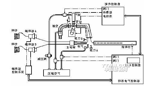 當(dāng)織機(jī)因緯紗故障而停車時(shí),為了減少擋車工處理停臺(tái)時(shí)間,降低勞動(dòng)強(qiáng)度,提高織機(jī)0生產(chǎn)效率,無梭織機(jī)還安裝有自動(dòng)找梭口裝置。高檔噴氣織機(jī)還配備有緯紗斷頭自動(dòng)處理系統(tǒng)。