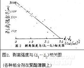 δ1和為δ2為兩種粘合高聚物的溶解度參數(shù),(δ1-δ2)可表示兩種高聚物的相容性,兩種物質(zhì)的溶解度參數(shù)越接近,則相容性越好。在P和q為常數(shù)的前提下,粘合強(qiáng)度隨相容性的增加而增加。如用log剝離強(qiáng)度對(δ1-δ2)作圖可得一直線。