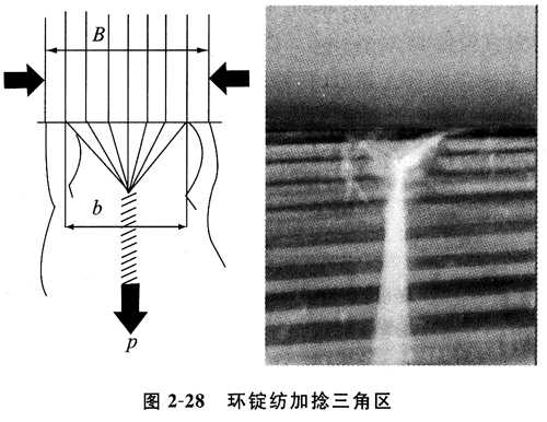在傳統環錠紡過程中,從牽伸系統出來的纖維束即達到了所紡紗線的定量。同時,纖維間的抱合力基本失去,因此剛剛到達以及正要離開前羅拉鉗口的單根纖維都處于無控制狀態,它們僅在捻度的作用下形成紗線。從前羅拉鉗口出來的須條寬度與紗線直徑之間的差異,是形成如圖2