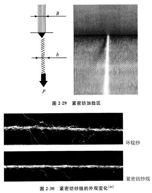 消除加捻三角區是提高紗線強度、降低紗線毛羽和飛花的有效方法,如圖2— 29所示。此時,須條寬度接近所紡紗線的直徑,纖維在須條內伸直平行排列,且相互間排列緊密,基本不存在加捻三角區和邊緣纖維。當緊密紡須條加捻成紗后,紗線毛羽量大幅降低,如圖2—30所示。