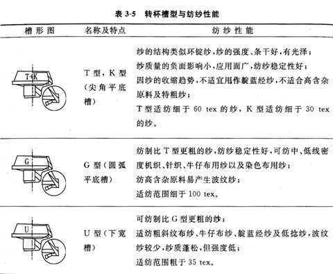 轉杯的凝聚槽有U型和V型兩大類,并由此派生出各種類型(例如,Auto—coro有T型和K型、G型、U型、S型、V型等)。槽的形狀、尺寸、凝聚角大小及其摩擦系數,對須條凝聚的緊密度和纖維間的抱合力有很大影響。