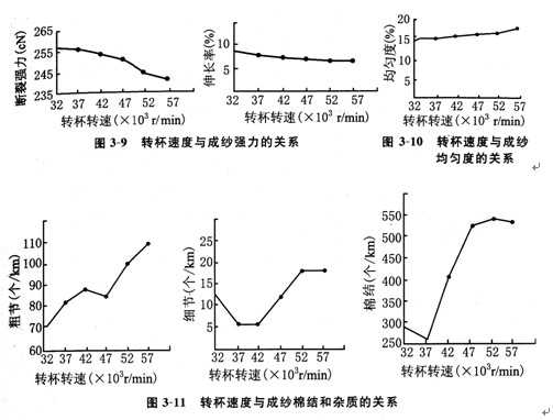 圖3—9、3—10、3—11、3—12的實驗結果表明轉杯速度增加對成紗強力、條干均勻度、棉結雜質、紗線毛羽的影響(試驗條件:棉纖維27mm×0.17tex,紡紗線密度27.8tex,捻度91.38捻/250px,轉杯直徑49mm,假捻盤直徑16mm)。