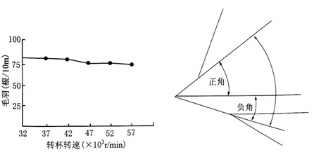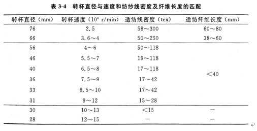 轉杯速度與直徑密切相關。轉杯速度不僅反映了該紡紗技術高速高產的水平,同時意味著紡紗張力大增,這對成紗質量有顯著影響。表3—4所示為轉杯直徑與轉杯速度和紡紗線密度及纖維長度的匹配關系。