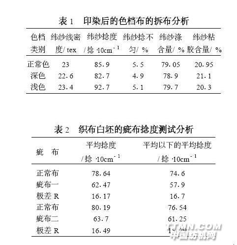 摘要: 通過對滌粘直貢印染成布色檔和坯布疵布的實物測試, 并結(jié)合破壞性試驗印染成布后的結(jié)果綜合分析, 找到了引起印染色布色檔的原因, 并提出了可行的解決措施。 關(guān)鍵詞: 滌粘直貢; 色檔; 原因; 解決措施 公司的產(chǎn)品滌粘直貢經(jīng)染色后的成布經(jīng)常出現(xiàn)色檔, 經(jīng)分析及試驗對比, 采取了有效的措施, 滌粘直貢印染后成布的色檔得到了較好的解決。 1 印染成布色檔的生產(chǎn)分析 品種: T80/ FB20 28/ 2316tex 496×299 根/10cm 170cm 直貢。 原料產(chǎn)地: 滌綸使用產(chǎn)地有儀征、自貢、烏魯木齊、上海、天津等地, 粘膠使用產(chǎn)地是成都。 色檔的分布形態(tài): 沿緯向整齊, 沿經(jīng)向20~50cm 寬。 根據(jù)生產(chǎn)流程、色檔現(xiàn)狀與染色機理綜合分析, 印染成布色檔是紗的捻度差異造成吸色不勻所致, 見表1 、表2 、表3 。 根據(jù)表1 實測分析, 深色和淺色印染成布在捻度上差異較明顯。根據(jù)表2 測試分析, 織布疵布是弱捻紗造成的。 .jpg)