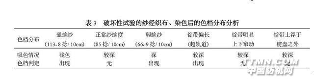 從破壞性試驗分析得知: 弱捻紗和強捻紗均會因吸色不勻而造成印染成布色檔(表3 中將錠帶超長視為弱捻紗) 。 2 色檔疵品原因分析 (1) 強捻紗當捻度超過正常紗15 捻/ 10cm 以上時, 纖維間纏繞更加緊密, 纖維間空隙較少, 吸收染料較少, 故印染成布成淺色。 (2) 弱捻紗當捻度低于正常紗15 捻/ 10cm 以上時, 纖維間纏繞較松軟, 纖維間空隙增大增多, 吸收染料更充分, 故印染成布成深色。 (3) 超過正常紗或低于正常紗的捻度在5~15捻/ 10cm 的紗, 經(jīng)織布, 印染后是否會出現(xiàn)色檔,需根據(jù)正常坯布上色的深淺, 使用紡紗原料的類別而定。 (4) 超過或低于正常紗捻度0~5 捻/ 10cm 的紗經(jīng)織布, 印染后基本上不會出現(xiàn)色檔。 (5) 錠帶上浮于錠盤之外和明顯上下竄動。本次試驗未出現(xiàn)色檔, 但