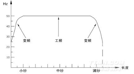 在小紗與大紗時,主電機由變頻驅動,中紗時由工頻驅動。可有效降低功耗,延長變頻器使用壽命。