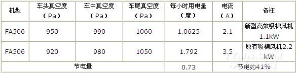 金馳在細紗機上配置高效吸棉風機有1.1kW、1.5kW兩種規格,替代原細紗機2.2KW、1.5KW軸流吸棉風機。它減少了壓力損失,提高了風機性能,具有近40%的節能效果,經濟效益十分顯著。我們在南通大生集團有限公司的經緯產FA506細紗機(480錠)上批量改造前、后實際測試數據如下: