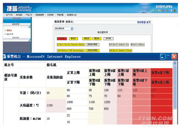 當機臺異常運轉、工藝參數超過正常范圍時,系統將立即反應,通過聲光報警裝置提醒現場操作人員及時進行調整,同時通過網絡將異常情況發生的機臺和參數,通報生產管理人員。