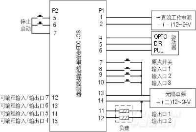 SC100B控制器提供兩個接口,P1口為14位接線柱,用于脈沖、方向、原點、3位輸入/2位輸出,所有信號經光電隔離,11、12腳輸出可驅動高達0.5A的負載。P2接口提供啟動、停止、4位輸入/輸出。對I/O口需求多的用途,用戶可用P2口,如需光隔的P2口信號則需另外購買與P2口相配的轉接板。