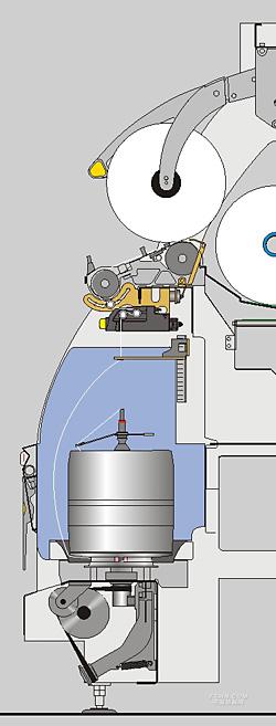 倍捻紗線的工藝路線 兩個喂入卷裝同時喂入是可能的。 并紗喂入卷裝(一個喂入卷裝) 兩根紗線已經(jīng)被(事先)合并到一個筒子上。 紗線從喂入卷裝上通過錠翼退繞。 錠翼的作用是防止紗線被喂入卷裝的邊緣卡住并保證紗線從卷裝上順利退繞。 單紗喂入卷裝(兩個喂入卷裝) 兩個疊在一起的卷裝,每個上面都是一根單紗。 未加捻的兩個疊在一起的卷裝被放在固定的錠罐內(nèi)。 紗線從喂入卷裝退繞通過錠芯的頂點穿入錠芯內(nèi)部的紗線通道以及掌力調(diào)節(jié)裝置。 紗線沿著儲紗盤的溝槽出來然后形成環(huán)繞固定錠罐的氣圈。氣圈導(dǎo)紗鉤的位置以及在某些機器型號中配備的氣圈罩決定了氣圈的大小。 然后紗線通過紗線傳感器的偏轉(zhuǎn)落淚來到預(yù)卷取軸。最后橫動導(dǎo)紗裝置引導(dǎo)紗線在卷取羅拉傳動的卷取筒管上。 |
