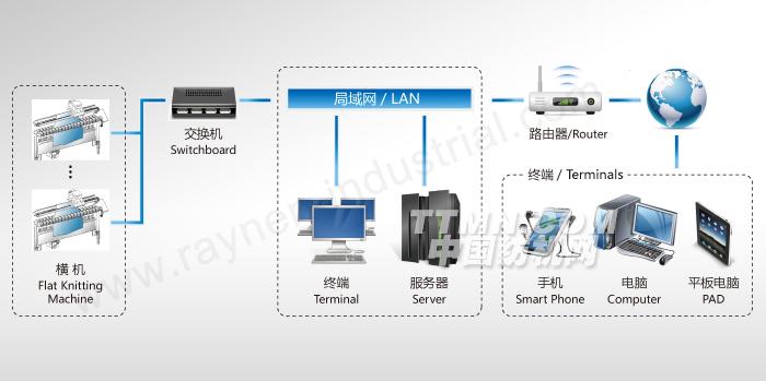 橫機網(wǎng)絡管理系統(tǒng)通過有線/無線局域網(wǎng)聯(lián)網(wǎng)技術與管理軟件,來控制和管理本地的橫機機群,用戶可以通過電腦、平板電腦、手機等終端來訪問管理軟件,實現(xiàn)對橫機的監(jiān)控和生產(chǎn)管理。