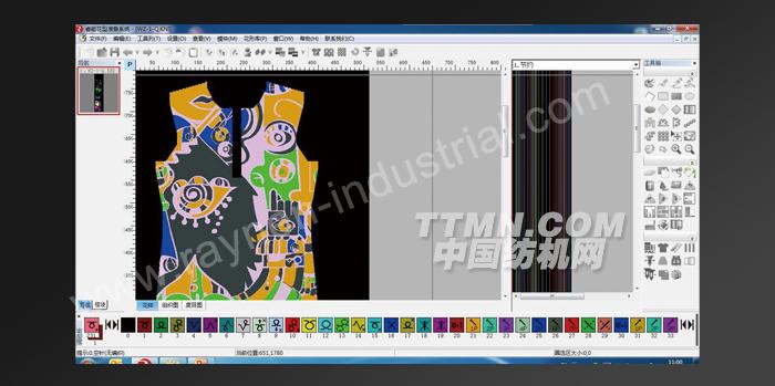 - 強(qiáng)大的編譯處理功能:包括壓線、打褶(縮針)、V領(lǐng)提花、嵌花銜接、自動(dòng)紗入紗出、